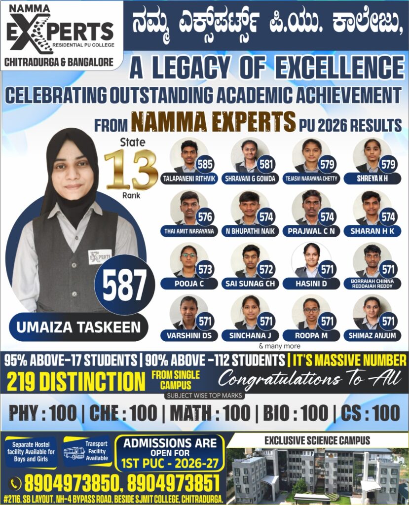 ಚಿತ್ರದುರ್ಗ: ನಗರದ ಪ್ರತಿಷ್ಠಿತ ಶಿಕ್ಷಣ ಸಂಸ್ಥೆಯಾದ ನಮ್ಮ ಎಕ್ಸ್ಪರ್ಟ್ಸ್ ಪಿಯು ಕಾಲೇಜು, 2025-26ನೇ ಸಾಲಿನ ದ್ವಿತೀಯ ಪಿಯುಸಿ ವಾರ್ಷಿಕ ಪರೀಕ್ಷೆಯಲ್ಲಿ ಅಭೂತಪೂರ್ವ ಯಶಸ್ಸು ದಾಖಲಿಸಿದೆ. ಕಾಲೇಜಿನ ವಿದ್ಯಾರ್ಥಿಗಳು ಶೇಕಡಾ 100ರಷ್ಟು ಫಲಿತಾಂಶ ಪಡೆಯುವ ಮೂಲಕ ಜಿಲ್ಲೆಗೆ ಮತ್ತು ಕಾಲೇಜಿಗೆ ಕೀರ್ತಿ ತಂದಿದ್ದಾರೆ.
