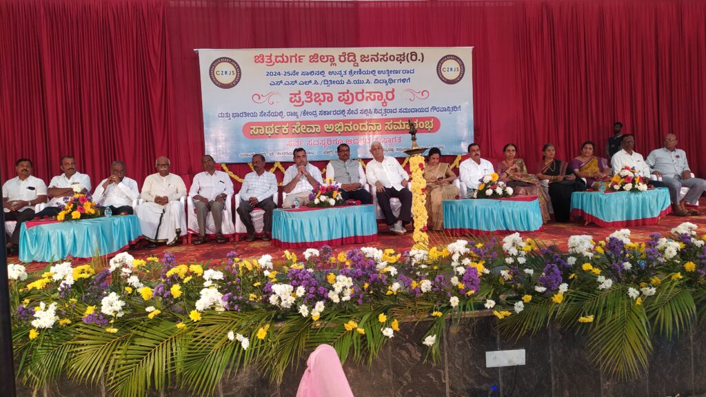 ಚಿತ್ರದುರ್ಗ ನಗರದ ಕಮ್ಮರೆಡ್ಡಿ ಸಭಾಂಗಣದಲ್ಲಿ ಗುರುವಾರ ಚಿತ್ರದುರ್ಗ ಜಿಲ್ಲಾ ರೆಡ್ಡಿ ಜನ ಸಂಘದವತಿ ಯಿಂದ ಹಮ್ಮಿಕೊಂಡಿದ್ದ 2024-25ನೇ ಸಾಲಿನಲ್ಲಿ ಉತ್ತೀರ್ಣರಾದ ಎಸ್.ಎಸ್.ಎಲ್.ಸಿ. ಮತ್ತು ದ್ವಿತೀಯ ಪಿಯು ವಿದ್ಯಾಥಿಗಳಿಗೆ ಪ್ರತಿಭಾ ಪುರಸ್ಕಾರ, ಭಾರತೀಯ ಸೇನೆಯಲ್ಲಿ ಸೇವೆ ಸಲ್ಲಿಸಿ ನಿವೃತ್ತರಾದ ರಾಜ್ಯ ಹಾಗೂ ಕೇಂದ್ರ ಸರ್ಕಾರದ ಸೇವೆ ಸಲ್ಲಿಸಿ ನಿವೃತ್ತರಾದ ಮತ್ತು ಸಮಯದಾಯದ ಗೌರವಾನ್ವಿತರಿಗೆ ಸಾರ್ಥಕ ಸೇವಾ ಅಭಿನಂದನಾ ಸಮಾರಂಭವನ್ನು ಉದ್ಘಾಟಿಸಿ ಮಾತನಾಡಿದ ಅವರು ಎಲ್ಲಾ ಮಕ್ಕಳಲ್ಲಿ ಪ್ರತಿಭೆ ಎನ್ನುವುದು ಇರುತ್ತದೆ, ಅದರೆ ಅದನ್ನು ಪತ್ತೇ ಮಾಡುವ ಕೆಲಸವಾಗಬಾಗಬೇಕಿದೆ ಅದು ಆದಾಗ ಮಾತ್ರ ಮಕ್ಕಳ ಪ್ರತಿಭೆಗೆ ಮನ್ನಣೆ ಸಿಗುತ್ತದೆ. ಇದೇ ರೀತಿ ಮಕ್ಕಳ ಪ್ರತೀಬೆಯನ್ನು ಗುರುತಿಸಿ ಅದಕ್ಕೆ ತಕ್ಕನಾದ ರೀತಿಯ ಪ್ರೋತ್ಸಾಹ ದೂರಕುವಂತಾಗಬೇಕಿದೆ ಎಂದರು.