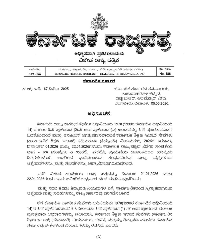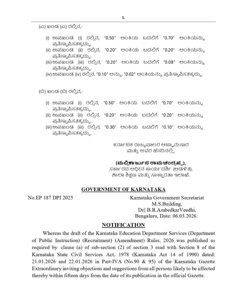 ಹೆಚ್ಚಿನ ಮಾಹಿತಿಗಾಗಿ: ಅಭ್ಯರ್ಥಿಗಳು ಶಿಕ್ಷಣ ಇಲಾಖೆಯ ಅಧಿಕೃತ ವೆಬ್ಸೈಟ್ www.schooleducation.kar.nic.in ಗೆ ಭೇಟಿ ನೀಡಿ ಪೂರ್ಣ ಪ್ರಮಾಣದ ಗೆಜೆಟ್ ಪ್ರತಿಯನ್ನು ಡೌನ್ಲೋಡ್ ಮಾಡಿಕೊಳ್ಳಬಹುದು.