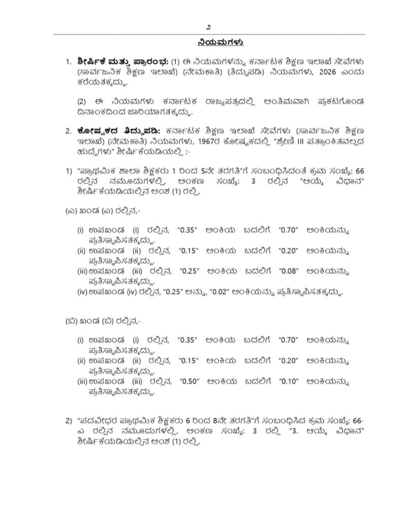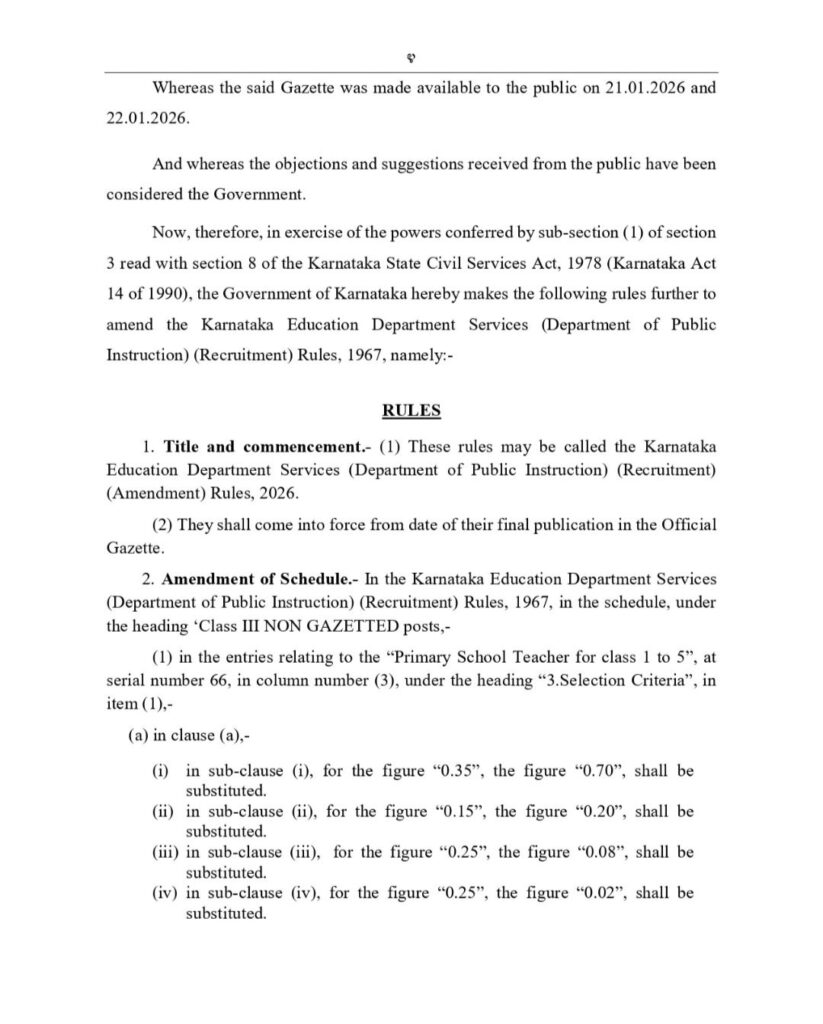 ಮಾರ್ಚ್12: ರಾಜ್ಯದ ಸರ್ಕಾರಿ ಶಾಲೆಗಳ 1 ರಿಂದ 5ನೇ ತರಗತಿ (Primary) ಮತ್ತು 6 ರಿಂದ 8ನೇ ತರಗತಿಯ (Graduate Primary) ಶಿಕ್ಷಕರ ನೇಮಕಾತಿ ಪ್ರಕ್ರಿಯೆಯಲ್ಲಿ ರಾಜ್ಯ ಸರ್ಕಾರವು ಕ್ರಾಂತಿಕಾರಿ ಬದಲಾವಣೆ ತಂದಿದೆ. ಇನ್ನು ಮುಂದೆ ಕೇವಲ ಅಂಕಗಳಷ್ಟೇ ಅಲ್ಲ, ಅಭ್ಯರ್ಥಿಯ ಸ್ಪರ್ಧಾತ್ಮಕ ಸಾಮರ್ಥ್ಯಕ್ಕೆ ಅತಿ ಹೆಚ್ಚು ಮನ್ನಣೆ ಸಿಗಲಿದೆ. ಈ ಕುರಿತು ‘ಕರ್ನಾಟಕ ಶಿಕ್ಷಣ ಇಲಾಖೆ ಸೇವೆಗಳು (ಸಾರ್ವಜನಿಕ ಶಿಕ್ಷಣ ಇಲಾಖೆ) (ನೇಮಕಾತಿ) (ತಿದ್ದುಪಡಿ) ನಿಯಮಗಳು-2024’ ಅನ್ನು ಅಧಿಕೃತವಾಗಿ ಜಾರಿಗೊಳಿಸಲಾಗಿದೆ.