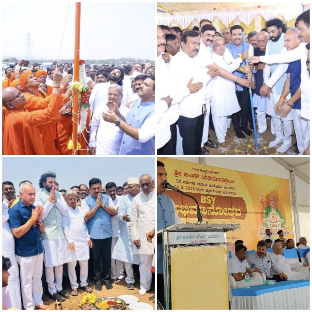 ಮಾಜಿ ಮುಖ್ಯಮಂತ್ರಿ ಬಿ.ಎಸ್.ಯಡಿಯೂರಪ್ಪ 50 ವರ್ಷದ ರಾಜಕೀಯ ಜೀವನದ ಹಿನ್ನಲೆಯಲ್ಲಿ ಮೇ. 9 ರಂದು ಚಿತ್ರದುರ್ಗ ನಗರದ ಹೊರವಲಯದ ಶ್ರೀ ಮಾದರ ಚೆನ್ನಯ್ಯ ಗುರುಪೀಠದ ಪಕ್ಕದಲ್ಲಿರುವ ಮೈದಾನದಲ್ಲಿ ನಡೆಸಲು ಉದ್ದೇಶಿಸಿರುವ ಅಭೀಮಾನೋತ್ಸವ ಕಾರ್ಯಕ್ರಮದ ಹಿನ್ನಲೆಯಲ್ಲಿ ಭಾನುವಾರ ಭೂಮಿ ಪೂಜೆ ಧ್ವಜಾರೋಹನ ಹಾಗೂ ಗೋ ಪೂಜೆಯನ್ನು ನೇರವೇರಿಸಿ ಮಾತನಾಡಿದ ಅವರು, ಯಡಿಯೂರಪ್ಪರವರೆಂದರೆ ರಾಜ್ಯದಲ್ಲಿ ಹೋರಾಟವನ್ನು ನಡೆಸುವ ವ್ಯಕ್ತಿ ಎಂದು ಗುರುತಿಸಲಾಗಿದೆ. ಬಿಎಸ್.ವೈ ಎಂದರೆ ಹೋರಾಟ ಎಂಬ ಮನೋಭಾವ ಎಲ್ಲರಲ್ಲೂ ಸಹಾ ಮೂಡಿದೆ.