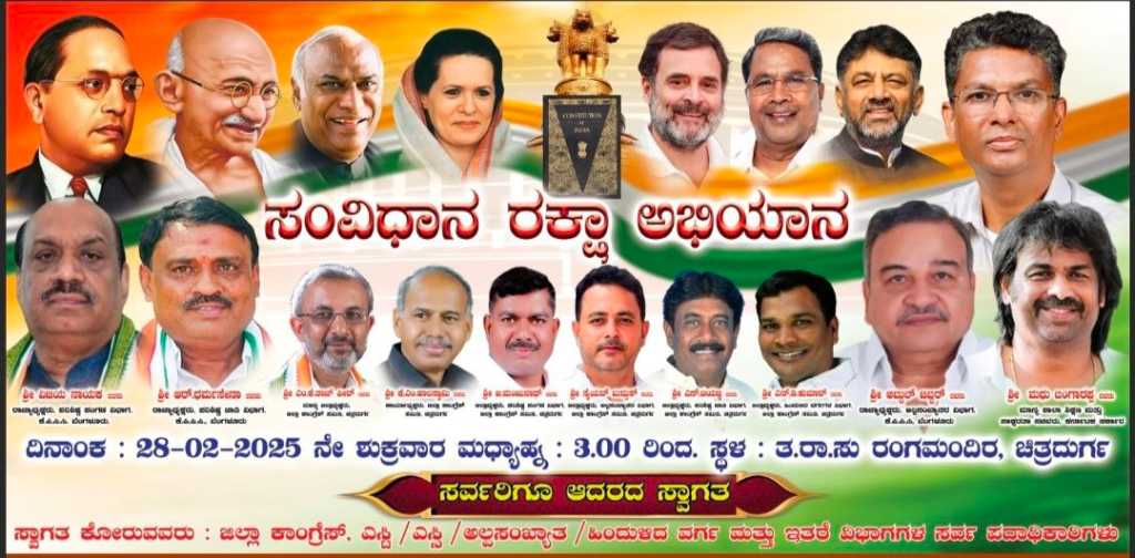 ಚಿತ್ರದುರ್ಗ ಫೆ. 27 ಕಾಂಗ್ರೆಸ್ನ ಪರಿಶಿಷ್ಟ ಪಂಗಡ, ಪರಿಶಿಷ್ಟ ಜಾತಿ, ಅಲ್ಪಸಂಖ್ಯಾತ ಹಾಗೂ ಹಿಂದುಳಿದ ವರ್ಗಗಳ ವಿಭಾಗದವತಿಯಿಂದ ಫೆ. 28 ರ ಶುಕ್ರವಾರ ಮಧ್ಯಾಹ್ನ 3 ಗಂಟೆಗೆ ನಗರದ ತರಾಸು ರಂಗಮಂದಿರದಲ್ಲಿ ಸಂವಿಧಾನ ರಕ್ಷಾ ಅಭಿಯಾನ ಕಾರ್ಯಕ್ರಮವನ್ನು