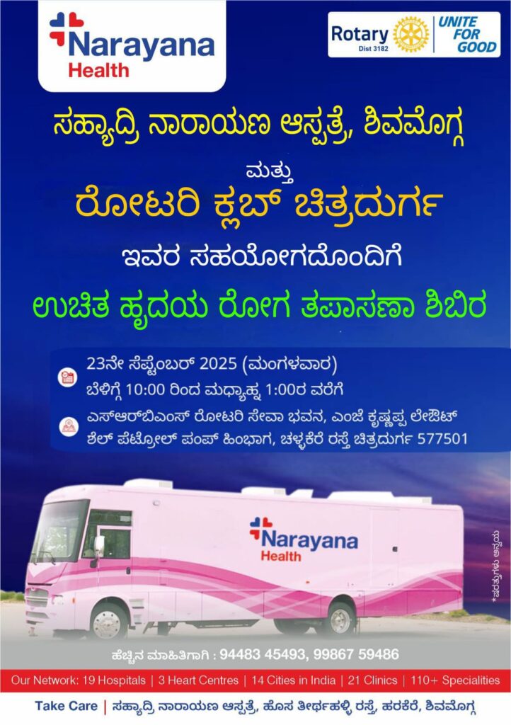 ಚಿತ್ರದುರ್ಗ : ಚಿತ್ರದುರ್ಗ ರೋಟರಿ ಕ್ಲಬ್ ಹಾಗೂ ಶಿವಮೊಗ್ಗ ಸಹ್ಯಾದ್ರಿ ನಾರಾಯಣ ಆಸ್ಪತ್ರೆ ಸಹಯೋಗದಲ್ಲಿ ಇಂದು ದಿನಾಂಕ : 23/09/2025 ರ ಮಂಗಳವಾರದಂದು ಬೆಳಗ್ಗೆ 10 ಗಂಟೆಯಿಂದ ಮಧ್ಯಾಹ್ನ 1 ಗಂಟೆಯವರೆಗೆ ಚಿತ್ರದುರ್ಗದ ಚಳ್ಳಕೆರೆ ರಸ್ತೆಯಲ್ಲಿರುವ ಎಸ್ಆರ್ ಬಿಎಂಎಸ್ ರೋಟರಿ ಸೇವಾ ಭವನದಲ್ಲಿ ಸಾರ್ವಜನಿಕರಿಗಾಗಿ ಉಚಿತ ಹೃದಯ ತಪಾಸಣಾ ಶಿಬಿರವನ್ನು ಏರ್ಪಡಿಸಲಾಗಿದೆ.
