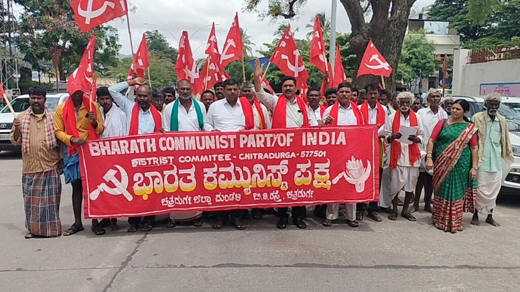 ಚಿತ್ರದುರ್ಗ ಜೂ. 17 ಮೊಳಕಾಲ್ಕೂರು ತಾಲ್ಲೂಕಿನ ಅರಣ್ಯ ಮತ್ತು ಕಂದಾಯ ಜಮೀನಿನ ಗಡಿ ಗುರುತು ಮಾಡಬೇಕು, ಹಾಗೂ ತಾಲ್ಲೂಕಿನ ಫಾರಂ ನಂ: 57ರ ಬಗರ್ ಹುಕ್ಕುಂ ರೈತರಿಗೆ ಸಾಗುವಳಿ ಕೊಡಲು ಅನುವು ಮಾಡಿಕೊಡುವಂತೆ ಆಗ್ರಹಿಸಿ ಭಾರತೀಯ ಕಮ್ಯುನಿಸ್ಟ್ ಪಕ್ಷದವತಿಯಿಂದ ಜಿಲ್ಲಾಧಿಕಾರಿಗಳ ಕಚೇರಿ ಮುಂದೆ ಪ್ರತಿಭಟನೆಯನ್ನು ನಡೆಸಿ ಜಿಲ್ಲಾಧಿಕಾರಿಗಳ ಮೂಲಕ ಅರಣ್ಯ ಸಚಿವ ಈಶ್ವರಖಂಡ್ರೆಯವರಿಗೆ ಸಲ್ಲಿಸಲಾಯಿತು.