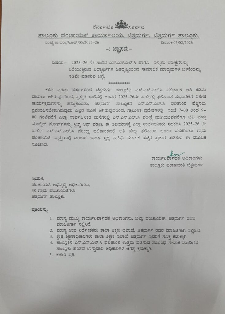 ​ಚಿತ್ರದುರ್ಗ: ತಾಲೂಕಿನಲ್ಲಿ ಎಸ್‌ಎಸ್‌ಎಲ್‌ಸಿ (SSLC) ಫಲಿತಾಂಶವನ್ನು ಸುಧಾರಿಸುವ ನಿಟ್ಟಿನಲ್ಲಿ ಚಿತ್ರದುರ್ಗ ತಾಲೂಕು ಪಂಚಾಯಿತಿ ಮಹತ್ವದ ಮತ್ತು ವಿಶಿಷ್ಟ ಆದೇಶವೊಂದನ್ನು ಹೊರಡಿಸಿದೆ. ಗ್ರಾಮೀಣ ಭಾಗದ ವಿದ್ಯಾರ್ಥಿಗಳ ವಿದ್ಯಾಭ್ಯಾಸಕ್ಕೆ ಅನುಕೂಲವಾಗುವಂತೆ ಸಂಜೆ ವೇಳೆ ಟಿವಿ ಮತ್ತು ಮೊಬೈಲ್ ಬಳಕೆಯನ್ನು ಕಡಿಮೆ ಮಾಡಲು ಸಾರ್ವಜನಿಕರಲ್ಲಿ ಮನವಿ ಮಾಡಿದೆ.