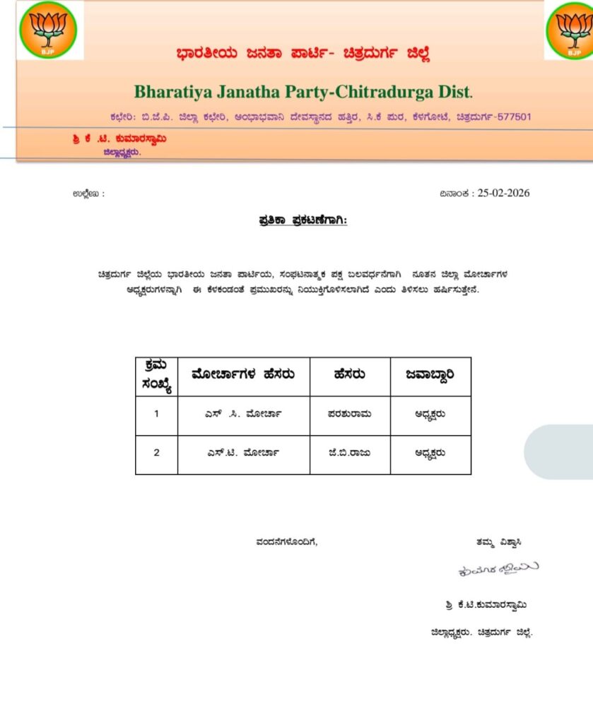 ಚಿತ್ರದುರ್ಗ ಫೆ. 25 ಭಾರತೀಯ ಜನತಾ ಪಕ್ಷದ ಚಿತ್ರದುರ್ಗ ಜಿಲ್ಲಾ ಘಟಕದ ಪರಿಶಿಷ್ಟ ಜಾತಿ ಹಾಗೂ ಪರಿಶಿಷ್ಟ ಪಂಗಡ ಮೋರ್ಚಾ ಜಿಲ್ಲಾಧ್ಯಕ್ಷರನ್ನು ಆಯ್ಕೆ ಮಾಡಲಾಗಿದೆ ಎಂದು ಜಿಲ್ಲಾಧ್ಯಕ್ಷರಾದ ಕೆ.ಟಿ.ಕುಮಾರಸ್ವಾಮಿ ತಿಳಿಸಿದ್ದಾರೆ.