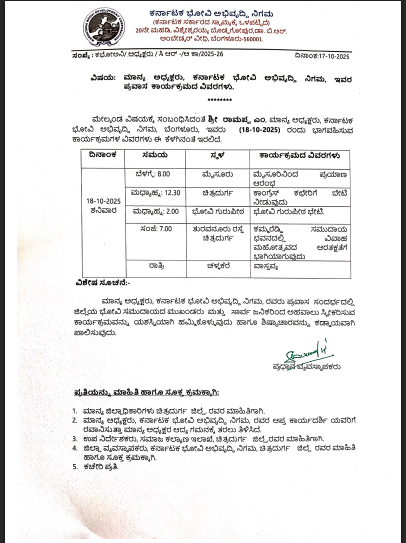 ಭೋವಿ ಅಭೀವೃದ್ದಿ ನಿಗಮದ ಅಧ್ಯಕ್ಷರಾದ ಎಂ.ರಾಮಪ್ಪರವರು ಅ. 18 ರಂದು ಚಿತ್ರದುರ್ಗ ಜಿಲ್ಲೆಯಲ್ಲಿ ಪ್ರವಾಸವನ್ನು ಮಾಡಲಿದ್ದಾರೆ. ಅ.18ರ ಬೆಳಿಗ್ಗೆ 8 ಗಂಟೆಗೆ ಮೈಸೂರಿನಿಂದ ಹೊರಟು, ಮಧ್ಯಾಹ್ನ 12.ಕ್ಕೆ ಚಿತ್ರದುರ್ಗವನ್ನು ತಲುಪಲಿದ್ದಾರೆ.