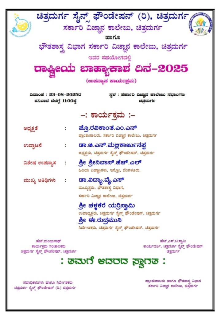 ಚಿತ್ರದುರ್ಗ ಸೈನ್ಸ್ ಫೌಂಡೇಶನ್ ಹಾಗೂ ಸರ್ಕಾರಿ ವಿಜ್ಞಾನ ಕಾಲೇಜು ಚಿತ್ರದುರ್ಗ,ಇವರ ಸಹಯೋಗದಲ್ಲಿ ರಾಷ್ಟ್ರೀಯ ಬಾಹ್ಯಾಕಾಶ