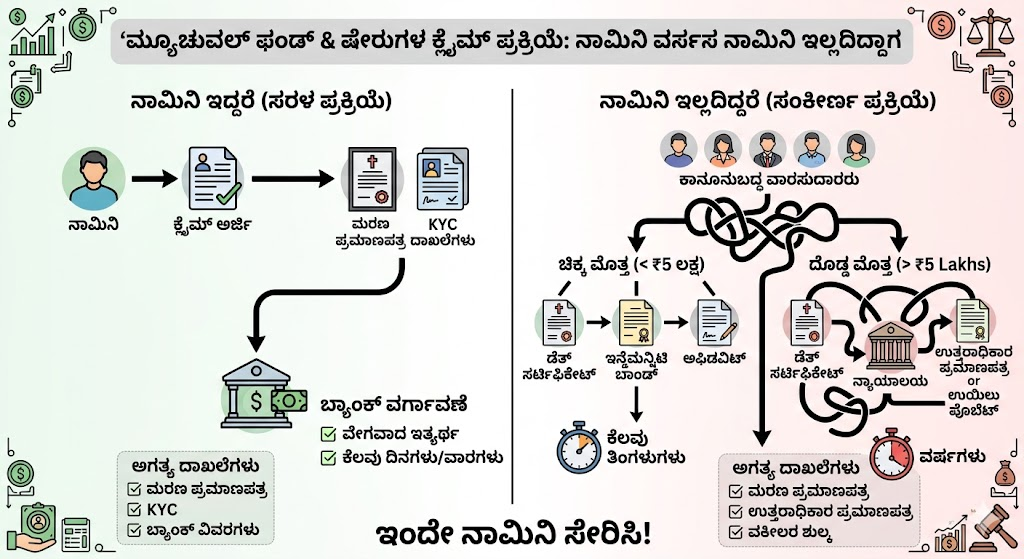 ಮ್ಯೂಚುವಲ್ ಫಂಡ್ ಮತ್ತು ಷೇರುಗಳಲ್ಲಿ ‘ನಾಮಿನಿ’ ನೇಮಿಸದಿದ್ದರೆ ನಿಮ್ಮ ವಾರಸುದಾರರು ಅನುಸರಿಸಬೇಕಾದ ಸಂಕೀರ್ಣ ಪ್ರಕ್ರಿಯೆಯನ್ನು ವಿವರಿಸುವ ದೃಶ್ಯ ಇಲ್ಲಿದೆ. ಈ ಚಿತ್ರವು ‘ನಾಮಿನಿ’ ಇದ್ದಾಗ ಸರಳವಾಗಿ ಮತ್ತು ‘ನಾಮಿನಿ’ ಇಲ್ಲದಾಗ ಹೇಗೆ ಕಠಿಣವಾಗಿ (ಅಲ್ಪ ಮತ್ತು ಹೆಚ್ಚಿನ ಮೊತ್ತಕ್ಕೆ) ಹಣ ವರ್ಗಾವಣೆಯಾಗುತ್ತದೆ ಎಂಬುದನ್ನು ಸ್ಪಷ್ಟವಾಗಿ ಹೋಲಿಸುತ್ತದೆ. ನಿಮ್ಮ ಕುಟುಂಬದ ಭವಿಷ್ಯದ ದೃಷ್ಟಿಯಿಂದ, ಇಂದೇ ‘ನಾಮಿನಿ’ ಸೇರಿಸುವುದು ಅತ್ಯಗತ್ಯ.